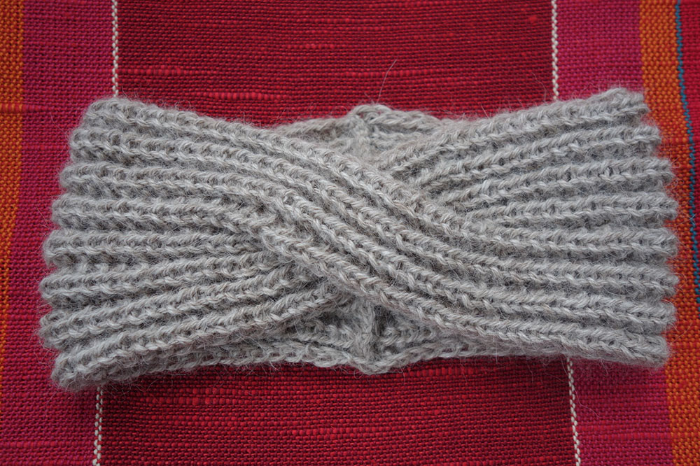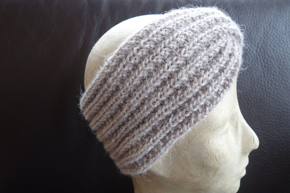 Dieses Stirnband ist vorne gekreuzt und das Muster lässt sich gut auseinander- bzw. zusammenschieben und der Frisur anpassen. Außerdem lässt sich die Länge beim Stricken leicht verändern.