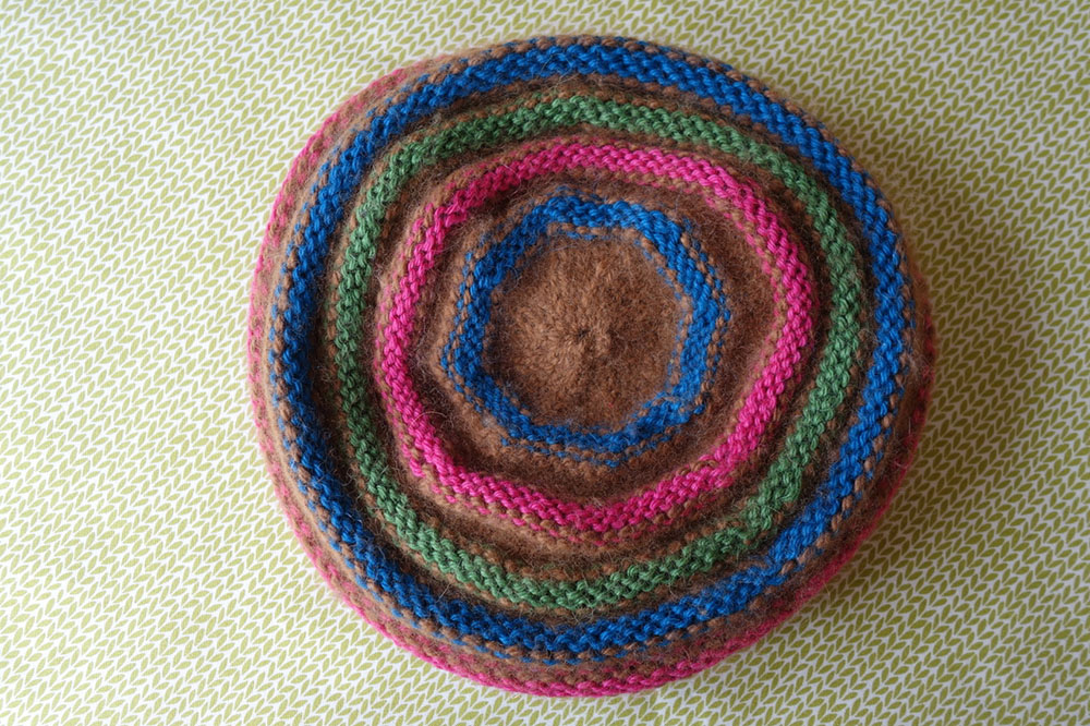 5 Rd li (die 1. und 5. Rd in der Grundfarbe stricken, die 2., 3. und 4. Rd bunt), 5 Rd re