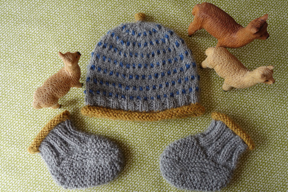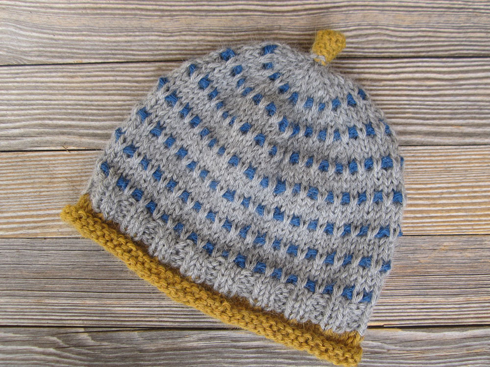1., 2., 3. und 5. R wie Grundmuster, in der 4. und 6. R gleichmäßig 8 x vereilt 2 M re zusammenstricken, dies noch mal wiederholen (= 40M) Nun die 1., 2. und 3. R lt. Grundmuster, danach in jeder R 8 x abnehmen bis nur mehr 8 M übrig sind. Über diese 8 M ca. 3 cm li in Nebenfarbe kleinen Schornstein stricken, abketteln und die Hälfte nach innen ziehen.