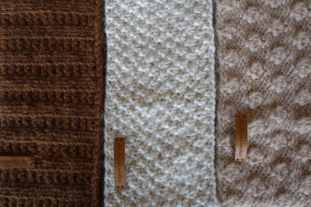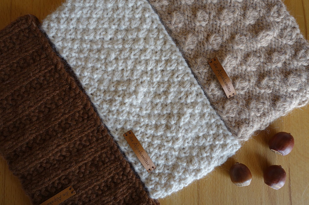 Drei Stirnbänder in natur, beige und braun aus der Wolle von unseren Alpakas Sindy, Gloria und Milli