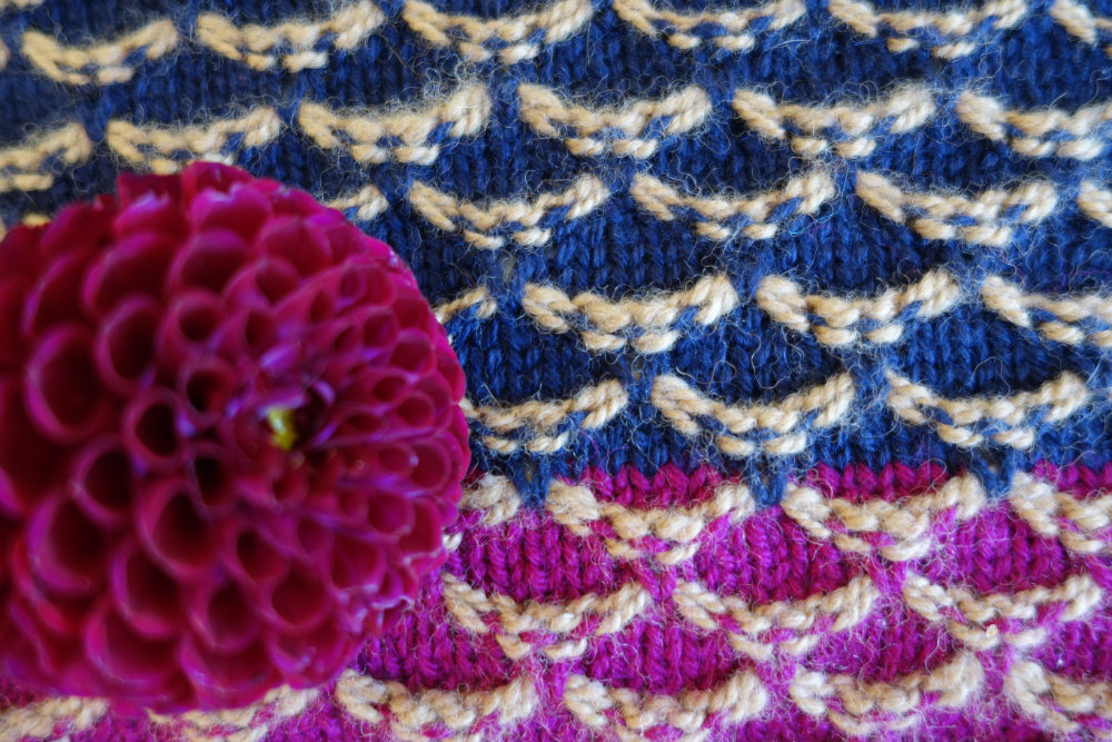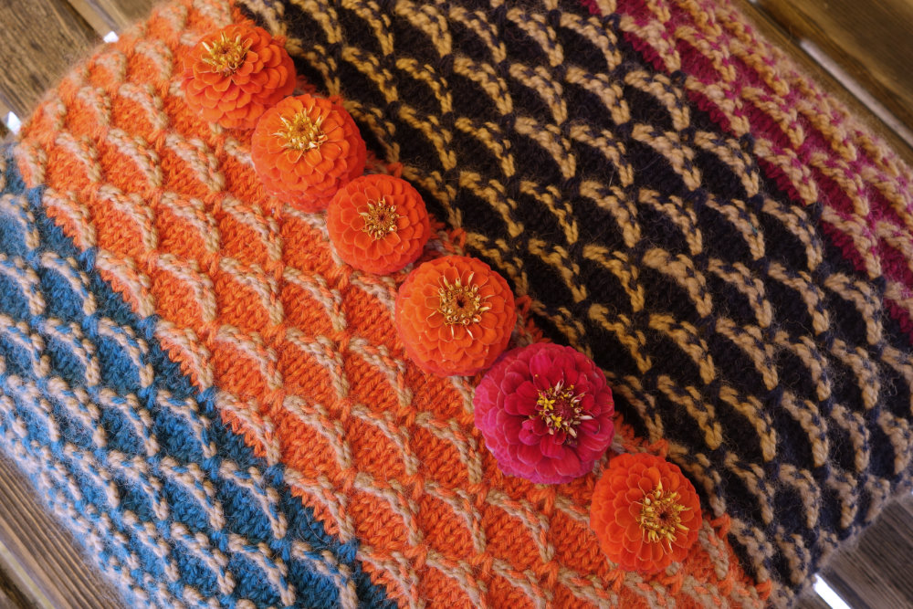 Für den Polster Luisa habe ich bunte Wolle aus den Anden mit fawnfarbener Wolle unserer Stute Luisa kombiniert, alles in Babyalpakaqualität. Das Muster ist sehr einfach zu stricken und auch gut für Anfänger geeignet. Durch die erhabenen Waben wirkt der Polster sehr bauschig und greift sich wunderbar weich an.